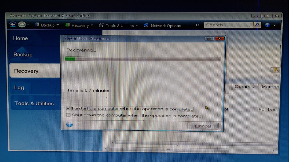 Recovery işlemi başlar. Kalan süre gösterilir. İşlem tamamlandığında sistem yeniden başlatılabilir.