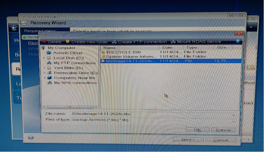 Daha önce alınan imaj dosyası (.tib/.tibx) seçilir. Bunun için “Browse” diyerek İmaj’ın bulunduğu disk seçilir, imaj dosyasına tıklanır ve “ok” denir.