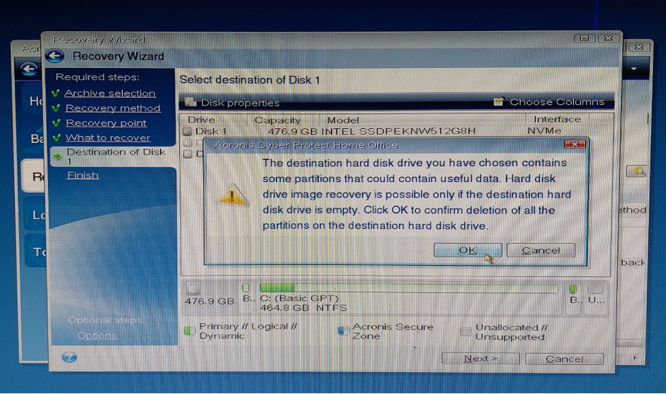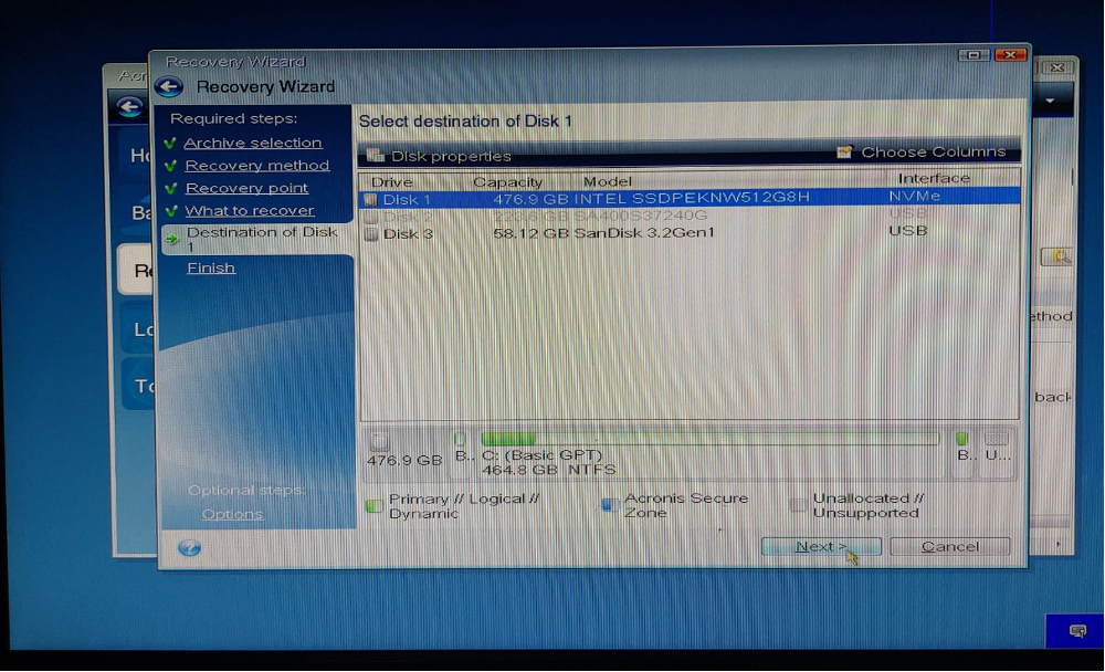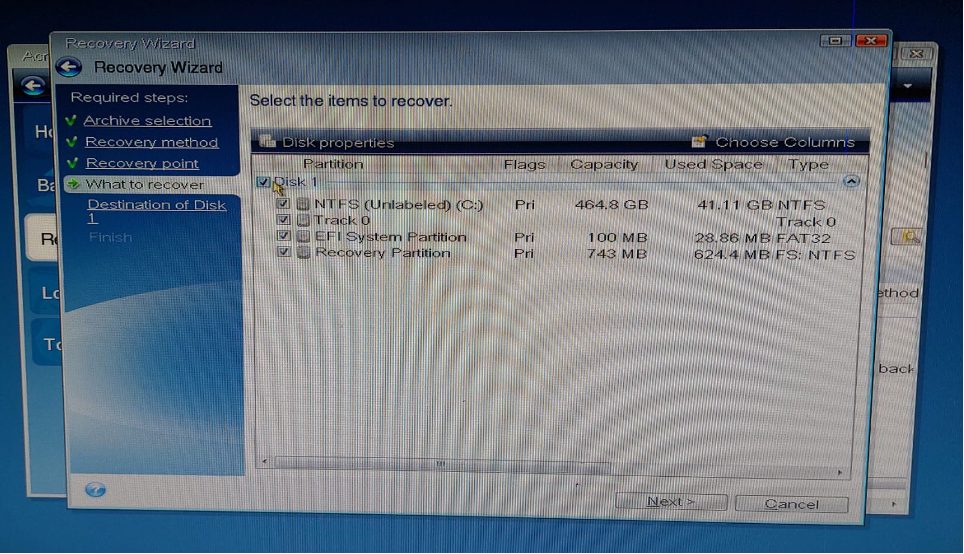 Geri yüklenecek bölümler işaretlenir (C:, EFI System Partition, Recovery Partition vb.). Biz herşeyi geri yükleyeceğimiz için en üstteki tiki (Disk 1) işaratleyip hepsini yükleyeceğiz. “Next” dedikten sonra çıkan uyarıda bir sonraki ekranı bekliyoruz.