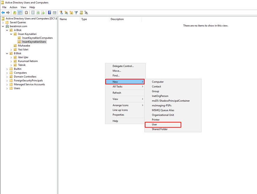 Öncelikle ‘Active Directory Users and Computers’ konsolunu açın. Kullanıcıyı oluşturmak istediğiniz Organizational Unit (OU) üzerine sağ tıklayın. Ardından ‘New’ -> ‘User’ seçeneğini tıklayın.