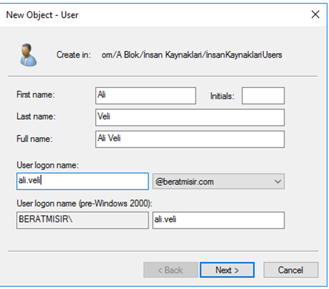 Açılan pencerede kullanıcının adı, soyadı ve kullanıcı adı (User logon name) gibi bilgileri girin. Bu bilgiler daha sonra giriş için kullanılacaktır.