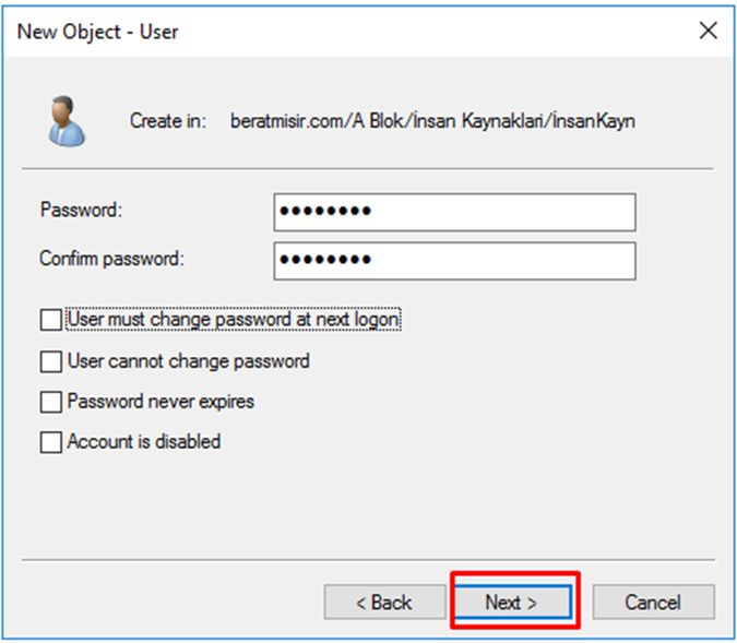 – User must change password at next logon: Kullanıcı ilk girişte parolayı değiştirmek zorunda kalır.