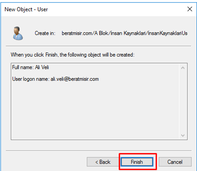 Son aşamada oluşturulan kullanıcı bilgilerini kontrol edin ve ‘Finish’ butonuna basarak işlemi tamamlayın.